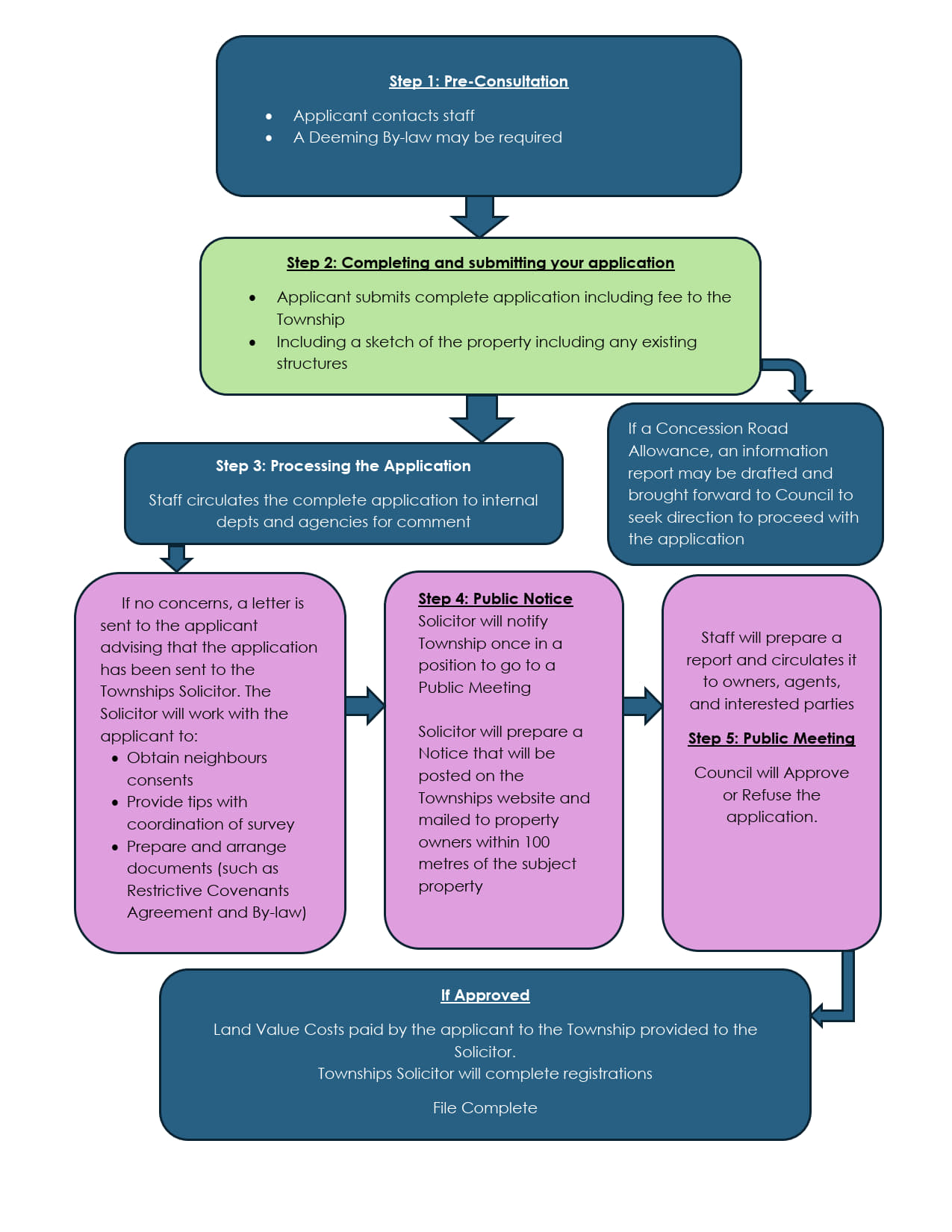 Council will consider applications to close and convey unopened shore road allowances and concession road allowances. This process involves several steps and associated expenses, including surveying, legal work, and administrative fees.